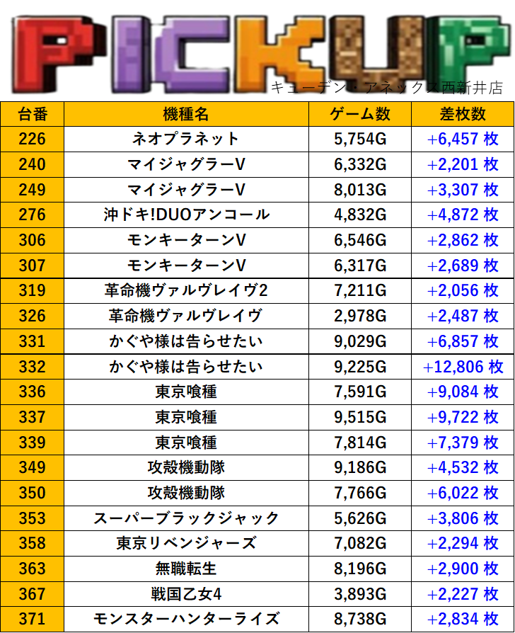 東京キューデン・アネックス西新井店 過去の取材結果はこちら 取材日 2026年2月21日(土) 並びの人数 抽選50名 / 一般17名 内容 スロミュー七福神 Pickup箇所① Pickup箇所② Pickup箇所③ Pickup箇所④ Pickup箇所⑤ Pickup箇所⑥ Pickup箇所⑦ Pickup箇所⑧ その他Pickup箇所 過去の取材結果はこちら
