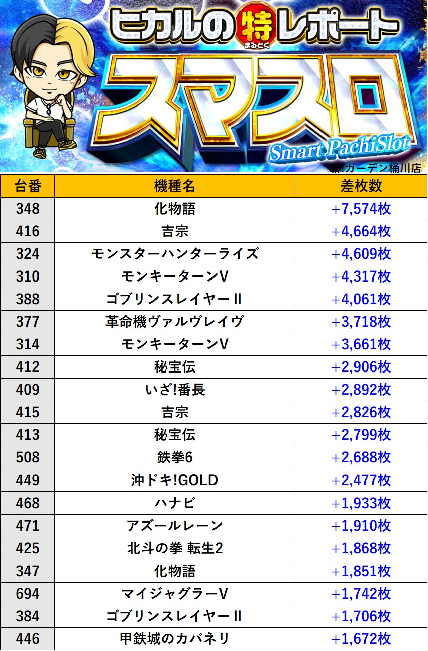 埼玉新!ガーデン桶川店 過去の取材結果はこちら 取材日 2026年2月20日(金) 並びの人数 抽選15名 / 一般20名 内容 ヒカルのまるとくレポート(スマスロ取材) ヒカルのまるとくレポートランキング Pickup箇所① Pickup箇所② Pickup箇所③ Pickup箇所④ Pickup箇所⑤ その他Pickup箇所 過去の取材結果はこちら