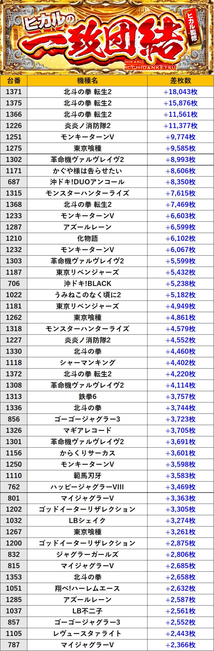 東京ジュラク王子店 過去の取材結果はこちら 取材日 2026年3月1日(日) 並びの人数 抽選142名 / 一般62名 内容 🌓ヒカルの一致団結🌓 『ヒカルの一致団結』ランキング 過去の取材結果はこちら