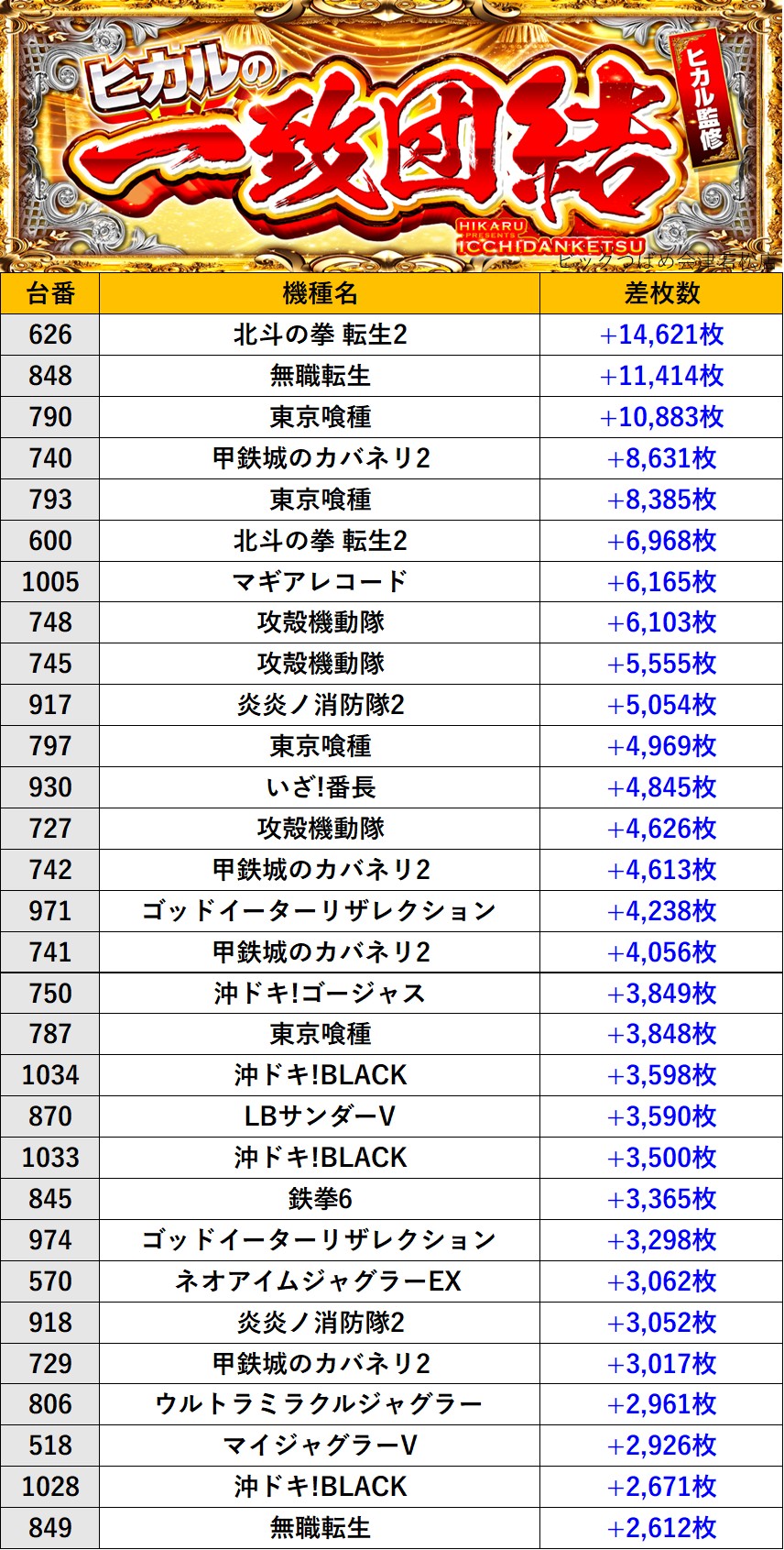 福島ビックつばめ会津若松店 過去の取材結果はこちら 取材日 2026年3月19日(木) 並びの人数 抽選79名 / 一般75名 内容 🌓ヒカルの一致団結🌓 『ヒカルの一致団結』ランキング 過去の取材結果はこちら