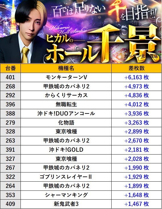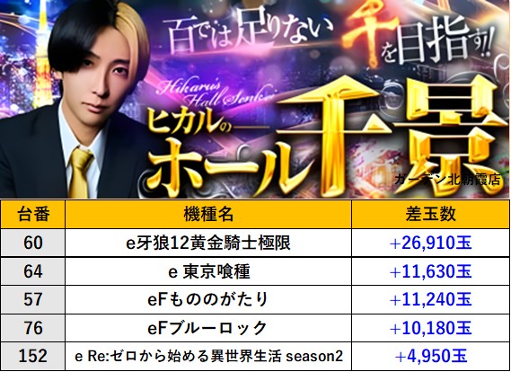埼玉ガーデン北朝霞店 過去の取材結果はこちら 取材日 2026年3月26日(木) 並びの人数 抽選11名 / 一般5名 内容 ヒカルのホール千景 『ヒカルのホール千景』ランキング 過去の取材結果はこちら