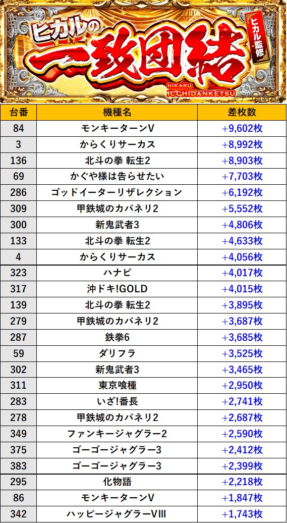 兵庫モナコ西明石店 過去の取材結果はこちら 取材日 2026年3月6日(金) 並びの人数 抽選149名 / 一般46名 内容 🌓ヒカルの一致団結🌓 『ヒカルの一致団結』ランキング 過去の取材結果はこちら