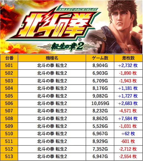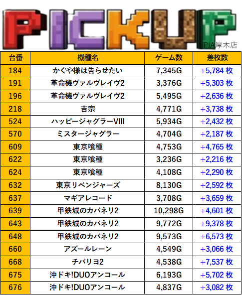 神奈川PIA厚木店 過去の取材結果はこちら 取材日 2026年3月27日(金) 並びの人数 抽選25名 / 一般25名 内容 スロミュー七福神 Pickup箇所① Pickup箇所② Pickup箇所③ Pickup箇所④ その他Pickup箇所 過去の取材結果はこちら