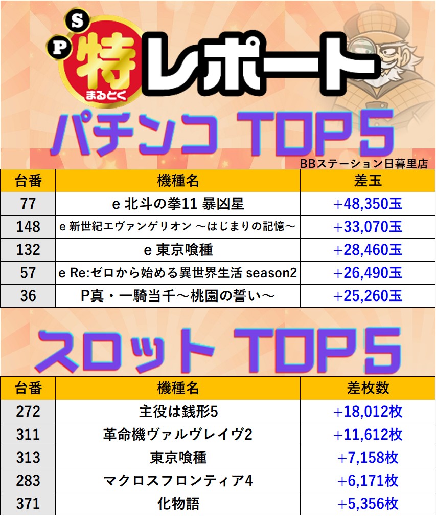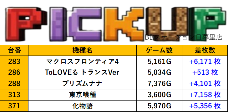 東京BBステーション日暮里店 過去の取材結果はこちら 取材日 2026年3月14日(土) 並びの人数 抽選27名 / 一般14名 内容 マル特レポート スロミューマル特レポートTOP5 Pickup箇所① Pickup箇所② Pickup箇所③ その他Pickup箇所 過去の取材結果はこちら