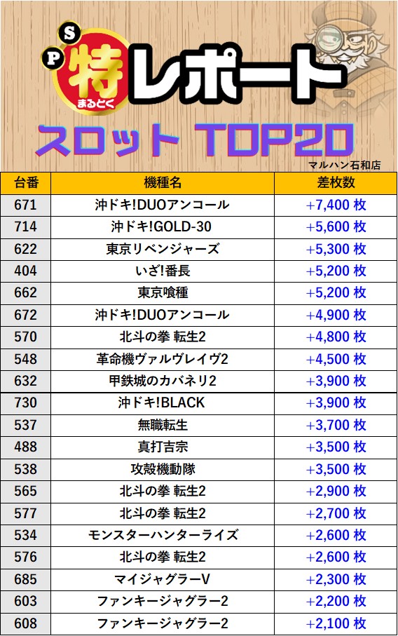 山梨マルハン石和店 過去の取材結果はこちら 取材日 2026年4月13日(月) 並びの人数 抽選20名 / 一般7名 内容 マル特レポート スロミューマル特レポートTOP20 Pickup箇所① Pickup箇所② Pickup箇所③ Pickup箇所④ 過去の取材結果はこちら