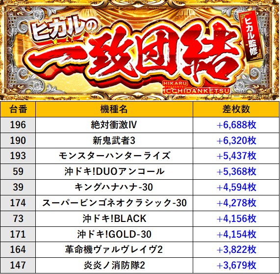 沖縄アムズガーデン赤道店 過去の取材結果はこちら 取材日 2026年4月11日(土) 並びの人数 抽選12名 / 一般38名 内容 🌓ヒカルの一致団結🌓 『ヒカルの一致団結』ランキング 過去の取材結果はこちら
