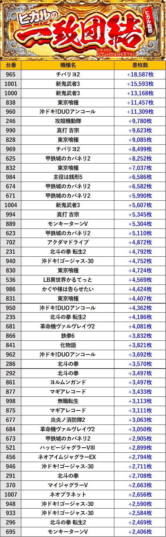 福島ビックつばめ須賀川店 過去の取材結果はこちら 取材日 2026年4月19日(日) 並びの人数 抽選75名 / 一般186名 内容 🌓ヒカルの一致団結🌓 『ヒカルの一致団結』ランキング 過去の取材結果はこちら
