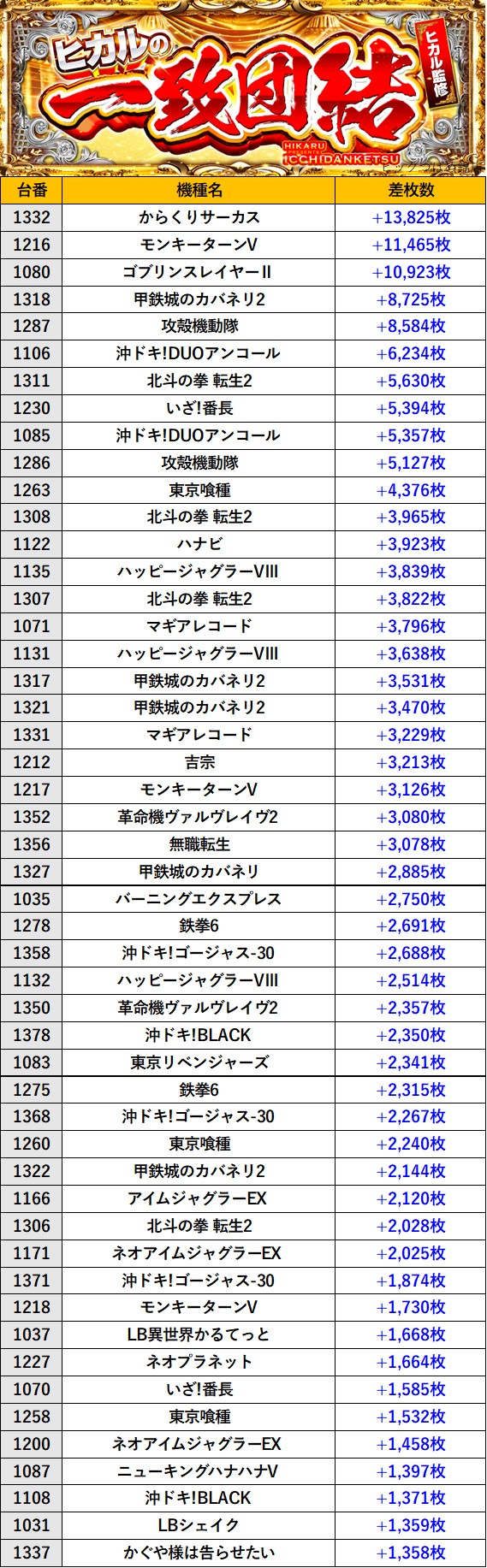 福島ビックつばめ錦店 過去の取材結果はこちら 取材日 2026年4月19日(日) 並びの人数 抽選47名 / 一般52名 内容 🌓ヒカルの一致団結🌓 『ヒカルの一致団結』ランキング 過去の取材結果はこちら