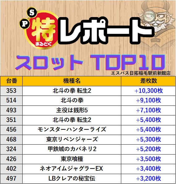 千葉エスパス日拓稲毛駅前新館店 過去の取材結果はこちら 取材日 2026年4月5日(日) 並びの人数 抽選40名 / 一般20名 内容 マル特レポート ネジレンジャー スロミューマル特レポートTOP10 スロミュー戦隊ネジレンジャーTOP10 Pickup箇所① Pickup箇所② Pickup箇所③ Pickup箇所④ その他Pickup箇所 過去の取材結果はこちら