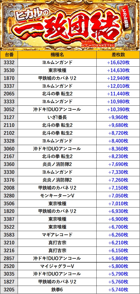 愛知プレイランドキャッスル熱田店 過去の取材結果はこちら 取材日 2026年4月18日(土) 並びの人数 抽選330名 / 一般121名 内容 🌓ヒカルの一致団結🌓 『ヒカルの一致団結』ランキング 過去の取材結果はこちら