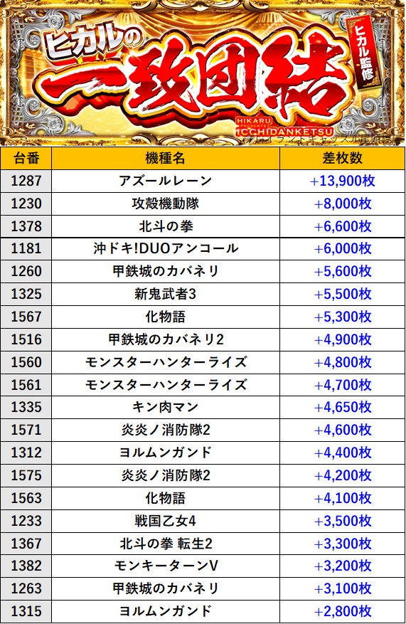 愛知プレイランドキャッスル尾頭橋店 過去の取材結果はこちら 取材日 2026年4月18日(土) 並びの人数 抽選38名 / 一般72名 内容 🌓ヒカルの一致団結🌓 『ヒカルの一致団結』ランキング 過去の取材結果はこちら