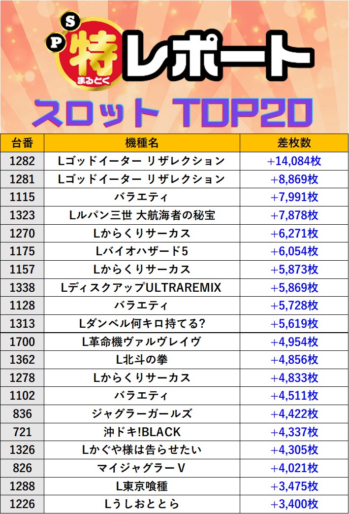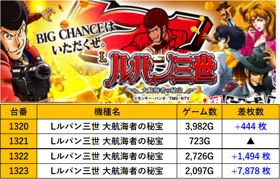 東京ジュラク王子店 過去の取材結果はこちら 取材日 2025年4月11日(金) 内容 応援ホール 誠新撰組 マル特レポートスマスロ マル特レポート華光 マル特レポート スロミューマル特レポートTOP20 Lルパン三世 大航海者の秘宝 LディスクアップULTRAREMIX L東京喰種 Lかぐや様は告らせたい L回胴黙示録カイジ 狂宴 Pickup箇所① Pickup箇所② Pickup箇所③ Pickup箇所④ Pickup箇所⑤ Pickup箇所⑥ 過去の取材結果はこちら